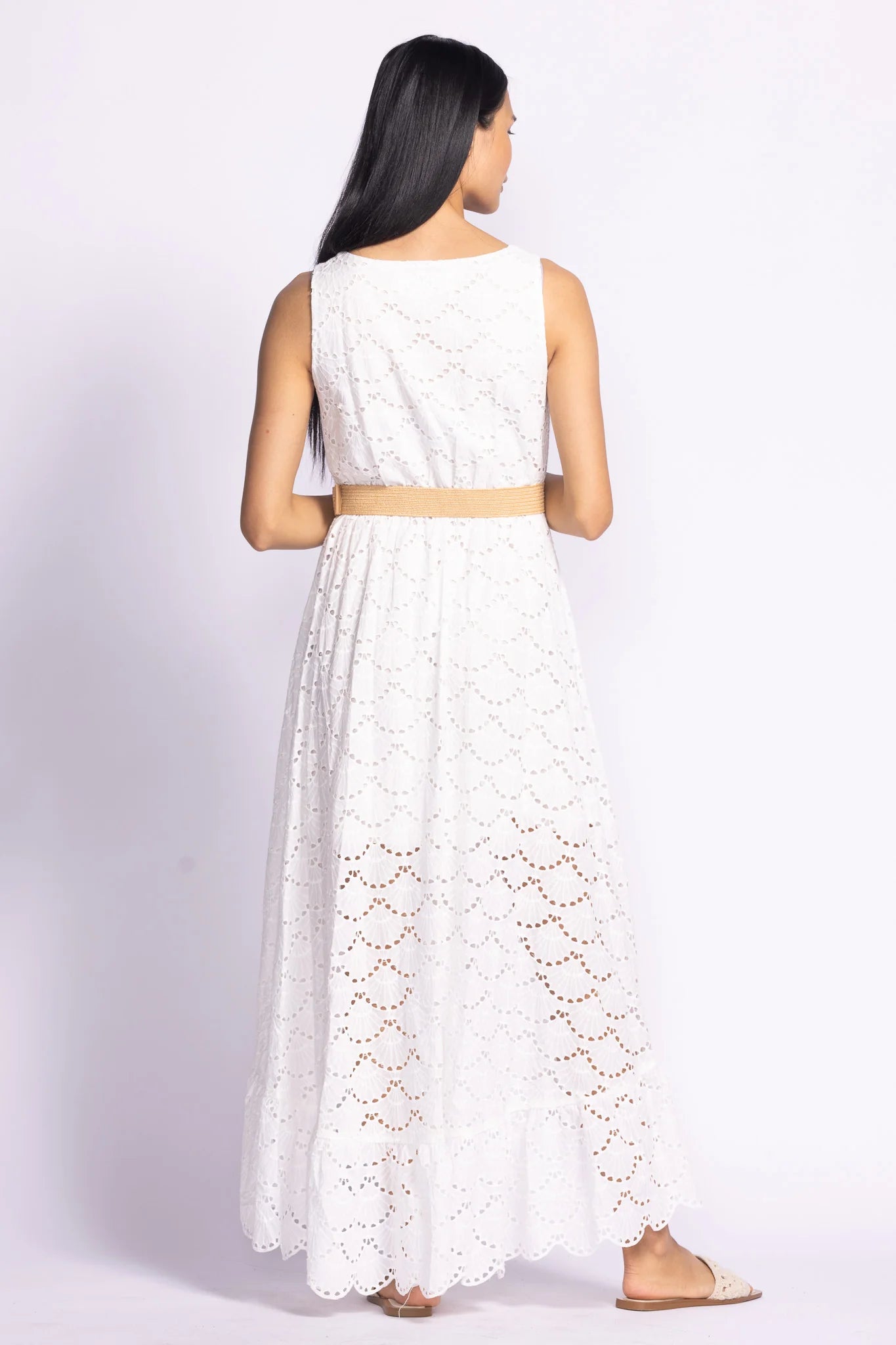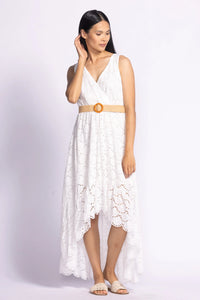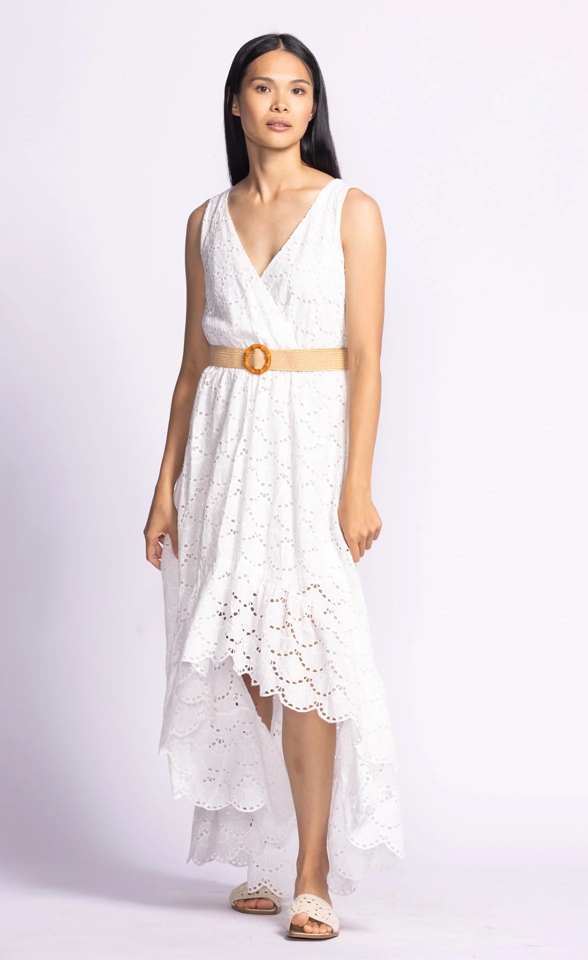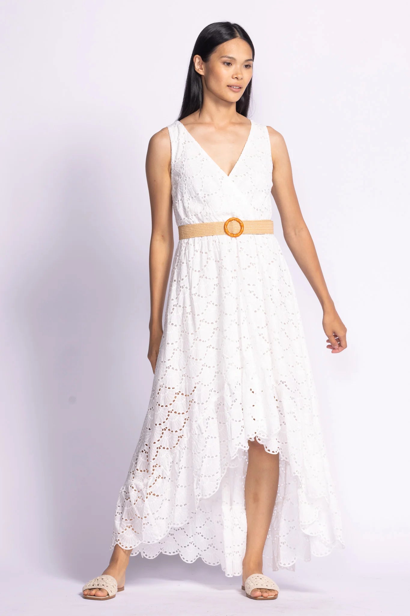 The Sutton Dress is a breezy high-low maxi dress made from intricate eyelet fabric for a romantic, airy feel. Featuring a flattering overlap V-neckline, scalloped hem, and a woven belt to cinch the waist, perfect for bohemian chic or resort-style looks.
